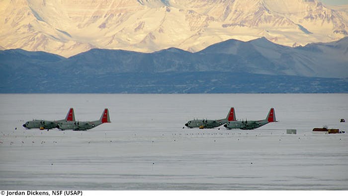 It is built each year on the Antarctic ice and used until December, when the ice melts. The photographer and pilot Maxime Pagnoux says: “A runway in the middle of nowhere built on the ice. As hard as concrete but a little more slippery!”