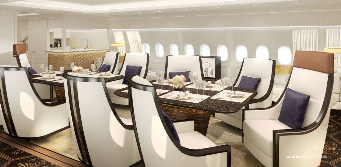 Jet Aviation’s concept, Shaheen (meaning royal white falcon), can accommodate up to 43 passengers plus eleven crew and features lounges; a game and cinema area; a state office; offices; and a master suite with spacious dressing and bathroom area; plus three extra guest bedrooms.