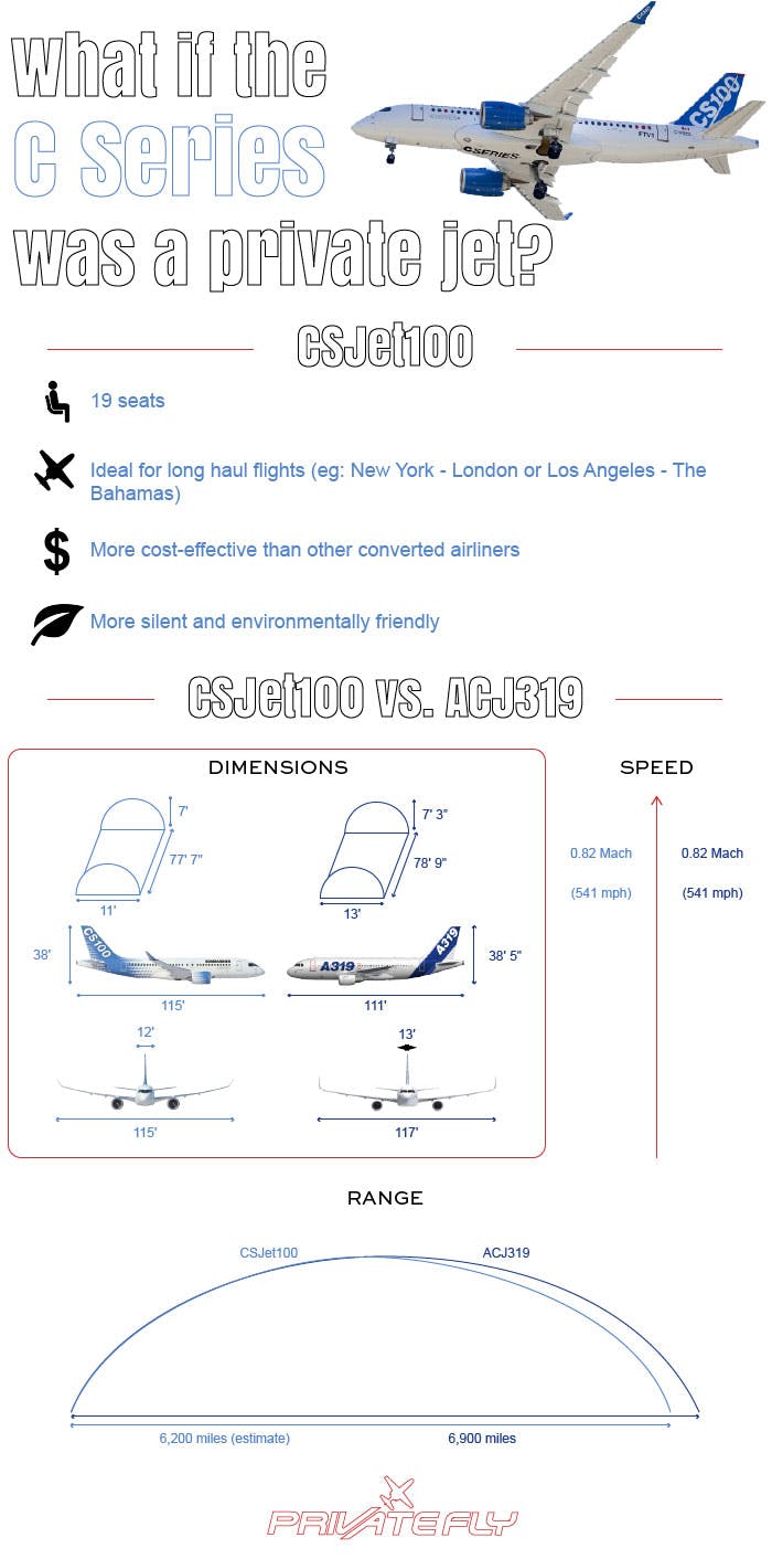 The dimensions of the C Series and and Airbus ACJ319 are very similar, but the latter has a slightly larger and taller cabin, giving more space for passengers.