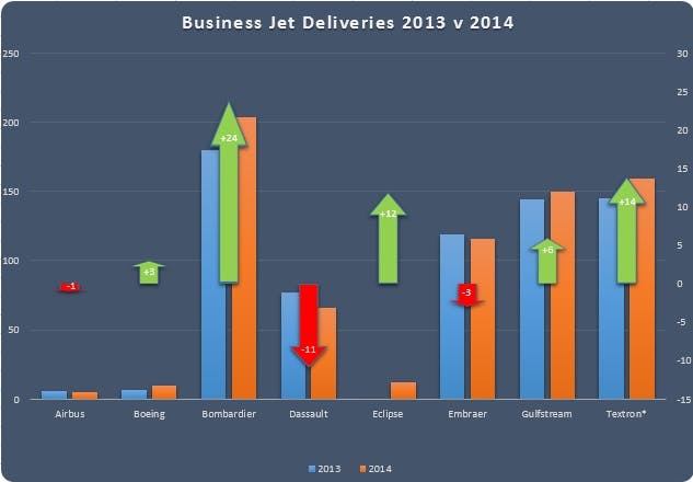 The most challenging year was seen by Dassault, who saw the steepest overall drop of -14% in deliveries, compared to 2013.