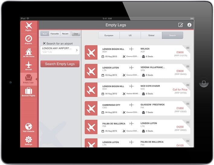 Search for current empty legs on the PrivateFly app, free to download from the App store and Google play.