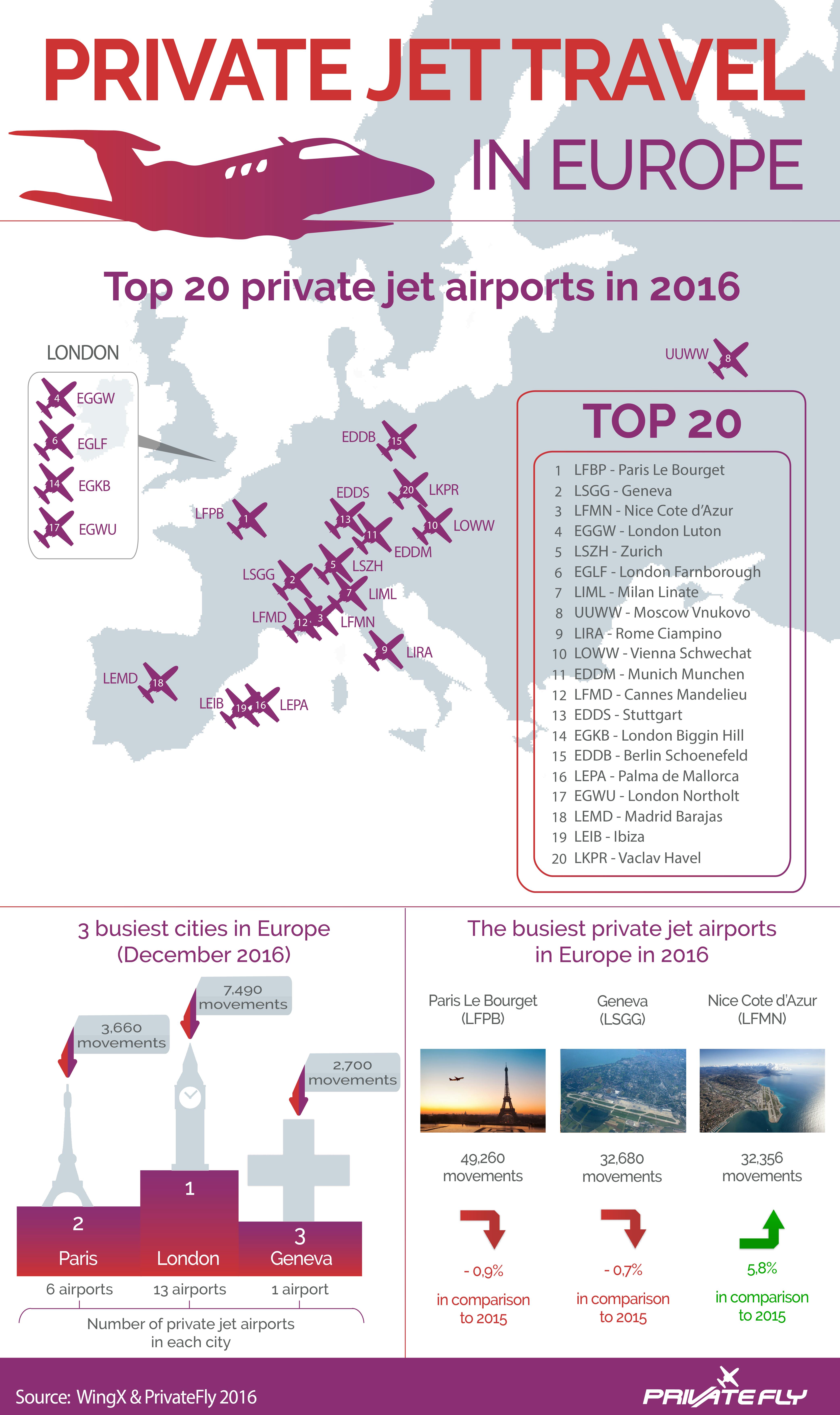 We looked at the Top 20 private jet airports in Europe, based on the number of flight movements (a take off or landing) that took place there by private aircraft in 2016.