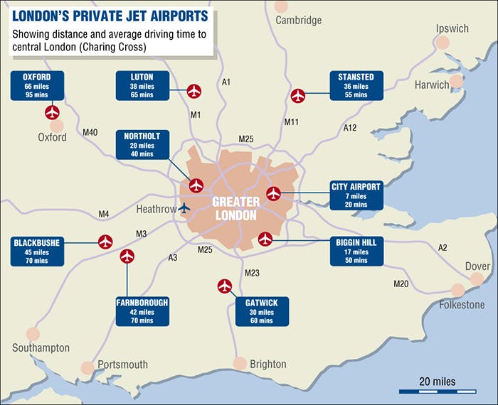 London is the busiest city for private jets in Europe, offering a choice of 14 airports for private jet travellers and a combined annual total of around 90,000 private jet movements (a take off or landing).