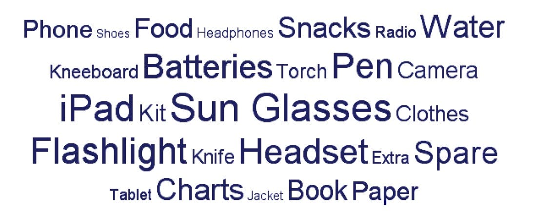 A very wide variety of other items were also listed – some more unusual than others – giving a fascinating flavour of what pilots do on their travels. These ranged from nail polish remover to Lego. Others said they always travel with pliers, fishing magazines, and even a saxophone.