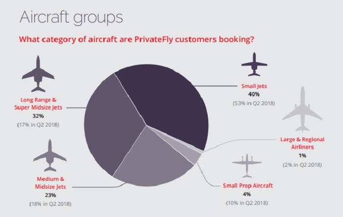 At PrivateFly 40% of customers choose to charter a small jet (with 2-7 seats), and the average duration of our flights is 2 hours 33 minutes. This is typical across the industry – with shorter flights in smaller aircraft representing a significant proportion of business aviation flight activity.