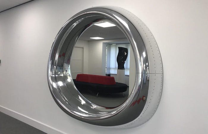 Intrepid Design’s aim is to turn an aircraft part into something that restores and showcases the original function, while also taking on a modern and exciting new form in itself. One of the new pieces in PrivateFly’s office is a spectacular mirror, made from an engine cowling. At almost 2 metres wide and 1.7 metres high, it’s a huge piece, weighing 75kg.