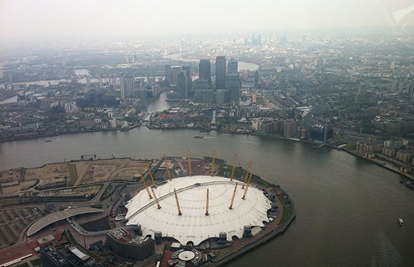 Ahead the O2 Arena / Dome and Greenwich and Canary Wharf come into view along with the classic curves of the River Thames.