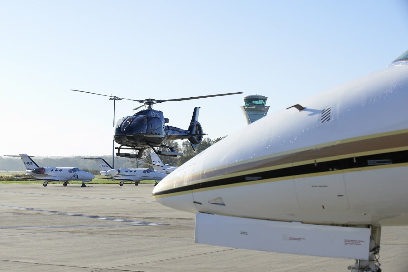 The passengers were driven in their Ferraria to The London Heliport in Battersea – the most central vertical gateway from the capital, where we had arranged for two helicopters waiting – a EC120 and EC130. After boarding, they enjoyed a short and scenic helicopter transfer across to the most stylish of London’s private jet airports, Farnborough. What better airport choice for a celebration of design?