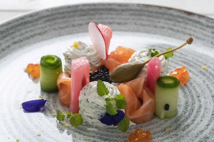 Aaron says: In my opinion, the British Smoked Salmon is the most popular dish. It’s bright, vibrant with full-bodied flavours, can be served in several ways and has a premium look on the plate. We serve it with poached rhubarb, pickled cucumber and a dill cream cheese. All of these elements are added to elevate the dish.
