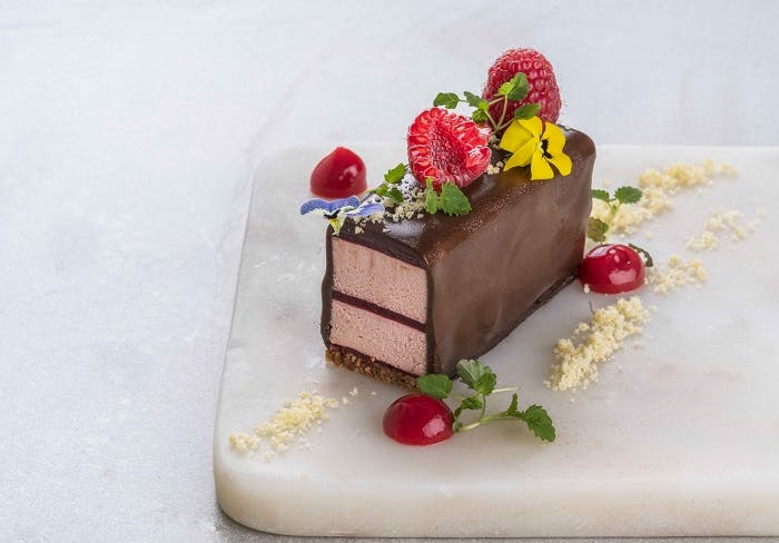 Also, a great dish is the Raspberry and Dark Chocolate Delice. The menu item itself is extremely complex in its preparation and with many stages of layering to achieve the final product. The dish itself is very summery and light. The chocolate glaze makes it luxurious and decadent and again the garnish and presentation make this a real high-end product promising to wow any client.