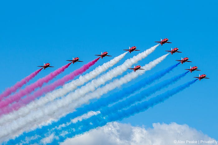 The Farnborough International Airshow 2014 opened in the usual fashion with a flypast from the Royal Air Force’s Red Arrows, making two passes over a packed crowd of industry professionals in sunny Hampshire.
