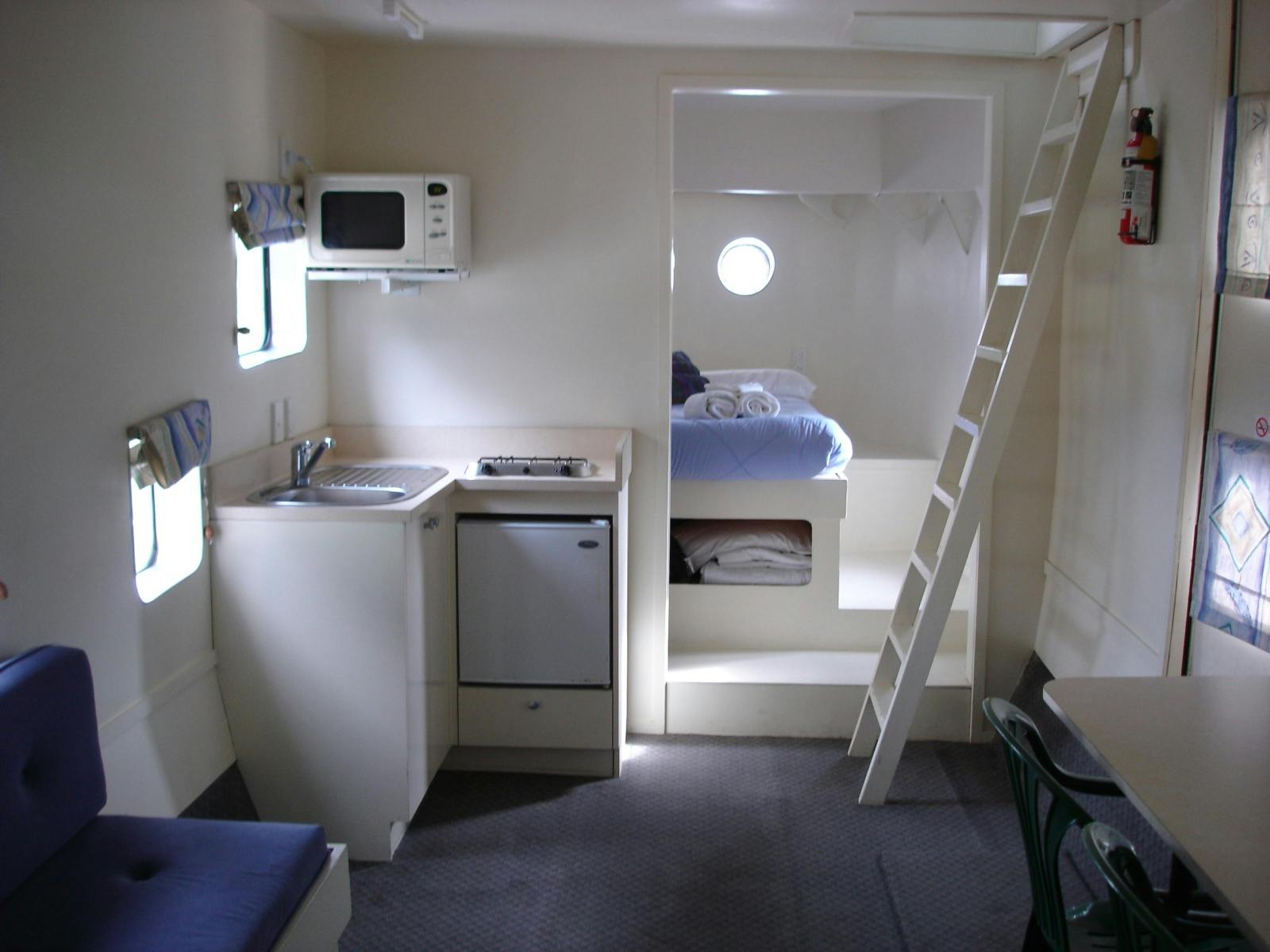 The grounded Freighter’s sleeping areas are in the cockpit and the rear tail, sleeping up to 4 people in one double bed and a set of bunks.