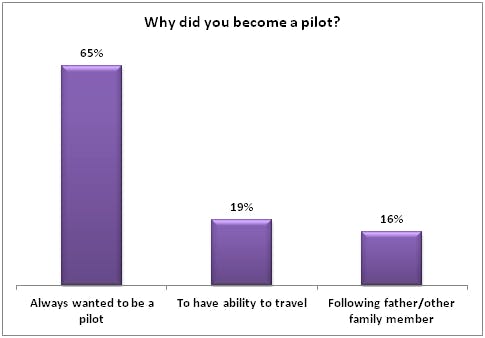 Some of the trends were common to all pilot types. When asked about their top 3 motivations for becoming a pilot, 65% said they entered the cockpit because of a passion for flying, held since childhood. And having a family member who was also pilot was the third most popular answer.