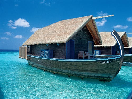 Cocoa Island is another first class example; accommodation here is inspired by the traditional dhoni boats sailed by local fishermen. Each room is reached via wooden jetties, and the terrace of each one steps down into the warm Maldivian sea.