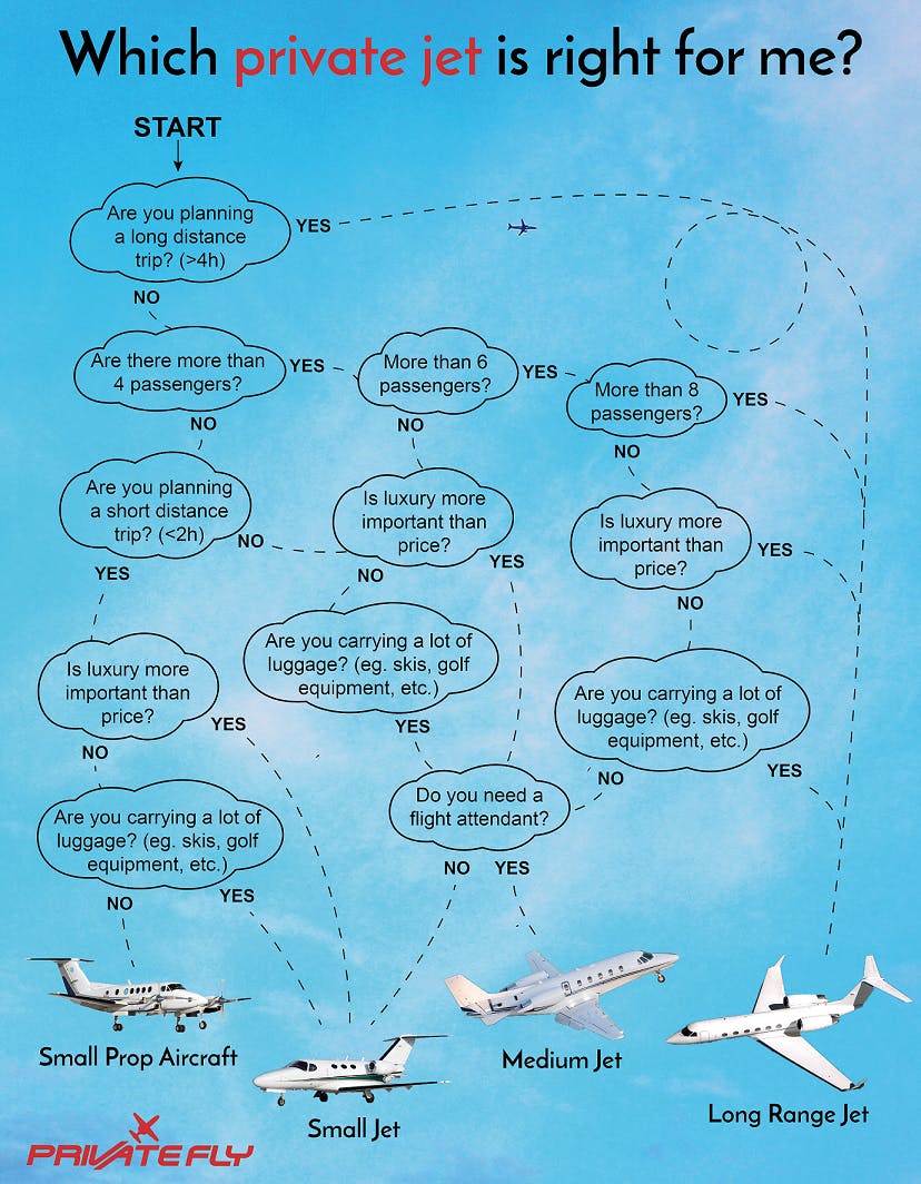 But to help you narrow it down, we’ve created the following flow chart. Follow the logic diagram below to discover which type of jet may be most suitable for your flight requirements.