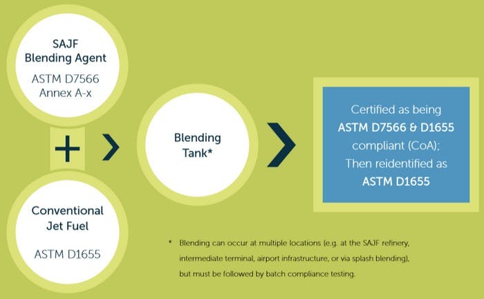 SAJFs have the same properties as conventional Jet-A and Jet A-1 fuels. They are interchangeable and compatible with these conventional fuels, and current rules mean they must be mixed with conventional fuel and used as a blend. They can be safely mixed during transport, airport storage or in the fuel tank of the aircraft.
